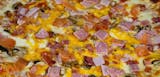 Ham, salami, pepperoni, mozzarella, cheddar, tomato, garlic, onions, mushrooms.